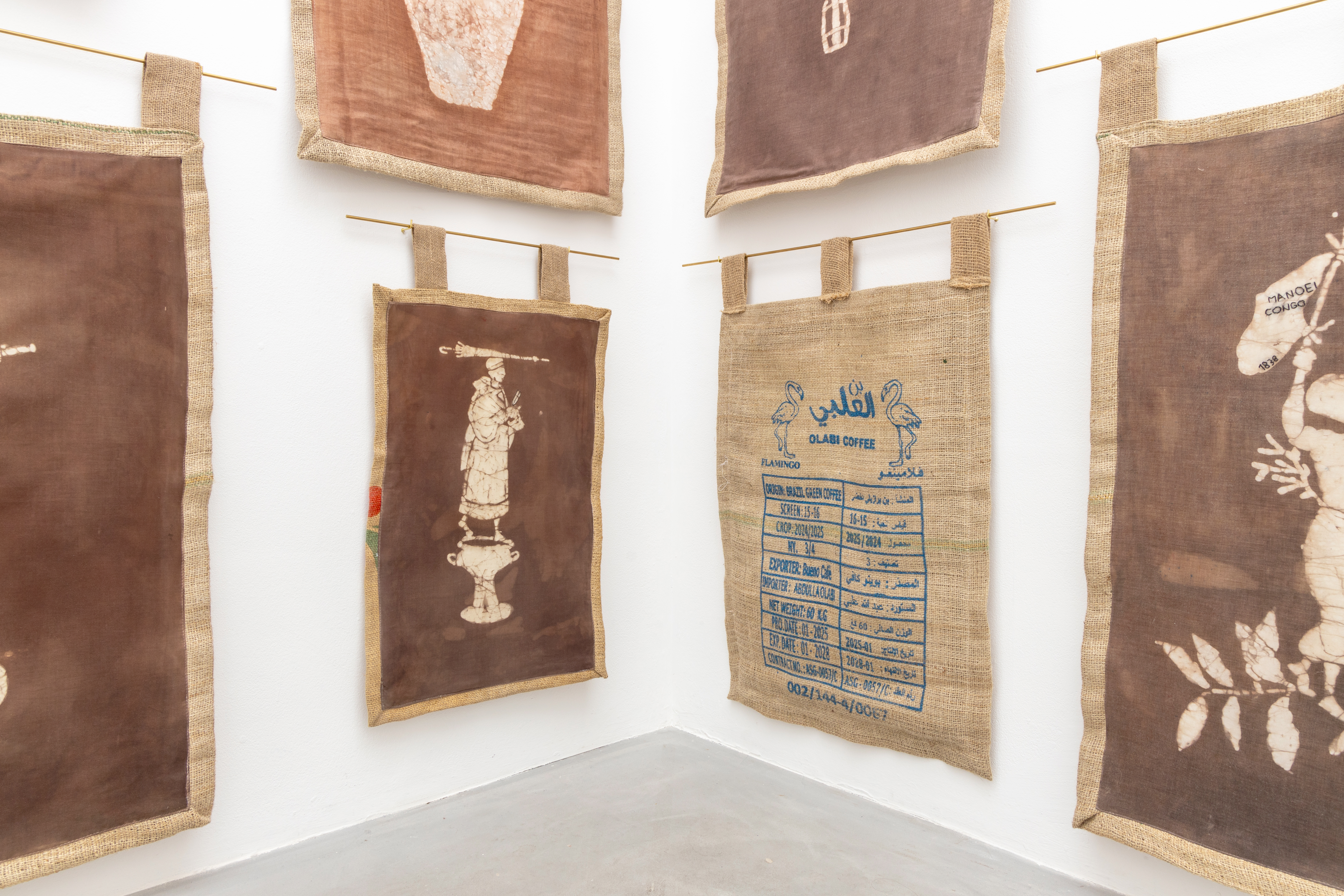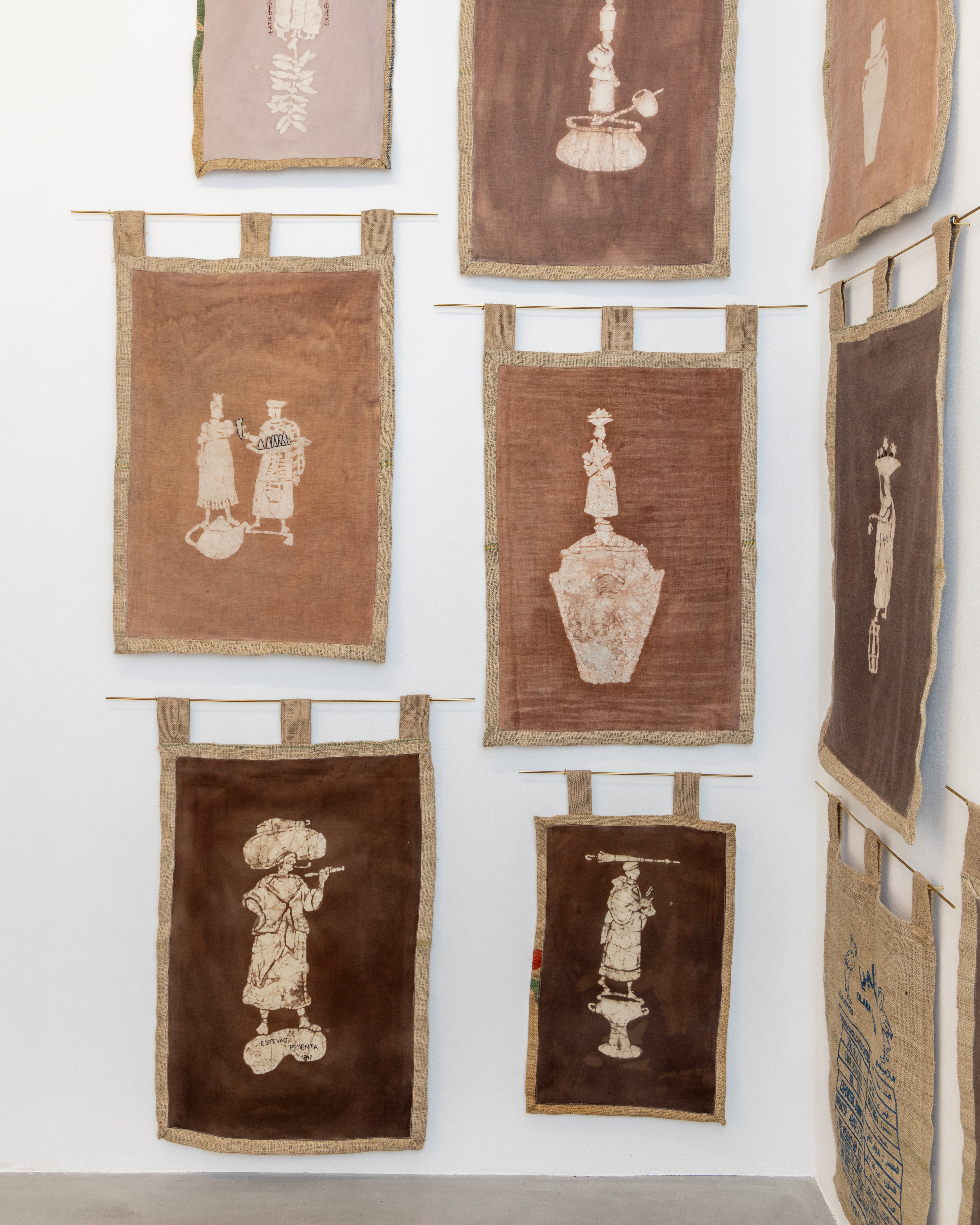 The artist’s attention to how historical representations are shaped translates into the creation of new visuals: the collages are a starting point for textile printing using batik, a technique of resist dyeing where wax protects the drawing from the pigment to come and, once removed, reveals the images in the fabric’s original colour. The final effect flirts with a sense of immateriality, with wavering lines reiterated by the instability of the jute frames, made from coffee sacks. These figures blend the historical with the surreal, and their display, sprawled across the walls, opens the opportunity for fictional, associative readings between them.