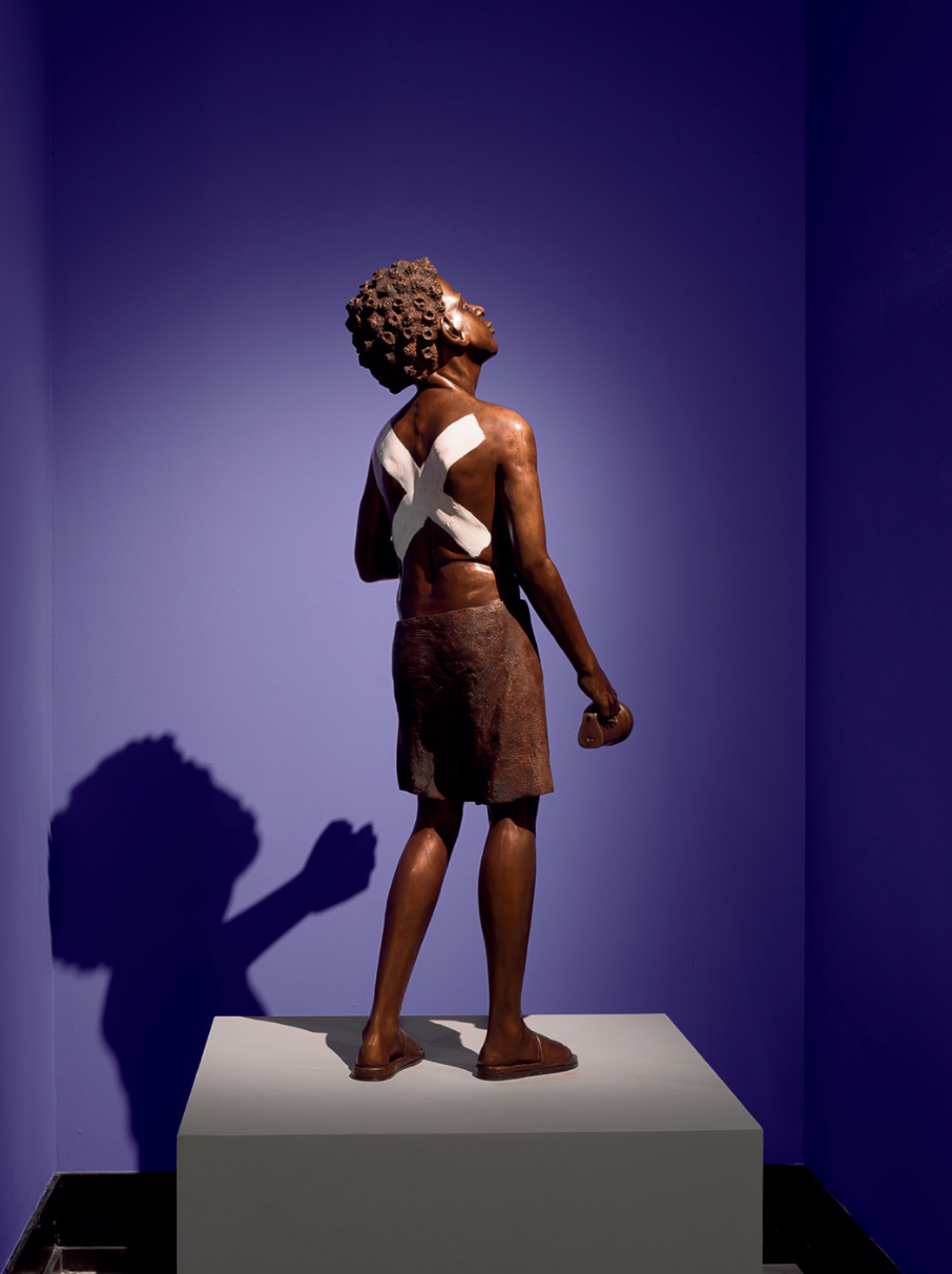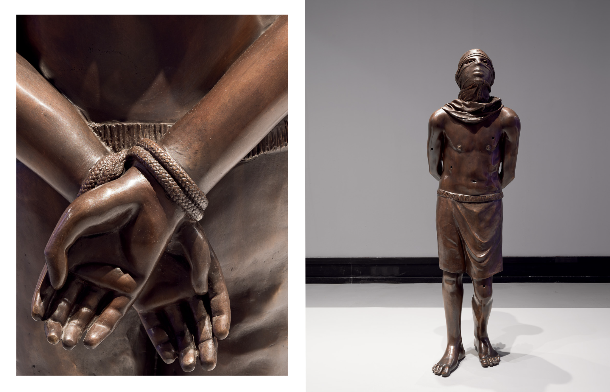 The potential for engagement contained in Flávio Cerqueira’s sculptures seems indisputable. It would be hard to find someone who has visited the Museu de Arte de São Paulo (MASP) in recent years and does not remember the iconic sculpture of the Black boy pouring a bucket of white paint over himself. ¹ It serves as an almost infallible key to recognizing the artist when name and surname are not enough. The sculpture of a boy contemplating his image in a mirror – which is part of the permanent collection of another of São Paulo’s most popular museums, Pinacoteca –, is another example of a work that elicits great public attention and interaction.² Another piece that prompts strong responses is Tião [Sebastian] (2017), that of a boy with his wrists tied behind his back with a rope, barefoot, his head covered by the shirt missing from his torso and his chest exposed with multiple bullet holes. Although people with different experiences would clearly establish varied readings, with their own nuances, it is unlikely that any Brazilian citizen would require additional context in order to elaborate a reading of this work the instant they come across it.