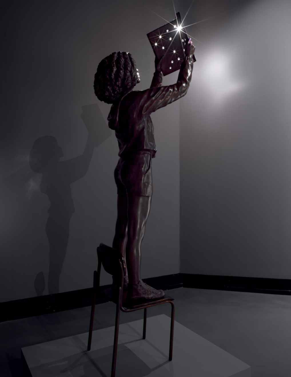 In the durability of bronze, in the moments caught in the act, or in the youth depicted, Flávio’s artistic production addresses ideas of permanence and mobility. In it, the youth portrayed ultimately consolidates an allegory of displacement and transience which is pertinent to addressing issues of exclusion and belonging (or the search for it). There is a literal displacement when the boy is positioned facing the wall, excluded, wearing a dunce’s hat in Foi assim que me ensinaram [This is the How They Taught Me] (2011); or an intention of mobility demonstrated when a boy sails over tree trunks with his gaze directed upward and forward in Logo ali [Right There] (2014); or when another boy prepares to take flight with wooden wings attached to his arms in Avua! [Fly!] (2013). Another form of displacement is the sense of projection contained in No meu céu ainda brilham estrelas [In My Sky Stars Still Shine] (2023), in the movement of a body that positions itself as high as possible, their feet on the seat of a chair, pointing a book up at the sky to see stars through it. The quest for mobility evident in some of the works transcends physical connotations when it is occasionally crossed by indicators of class.