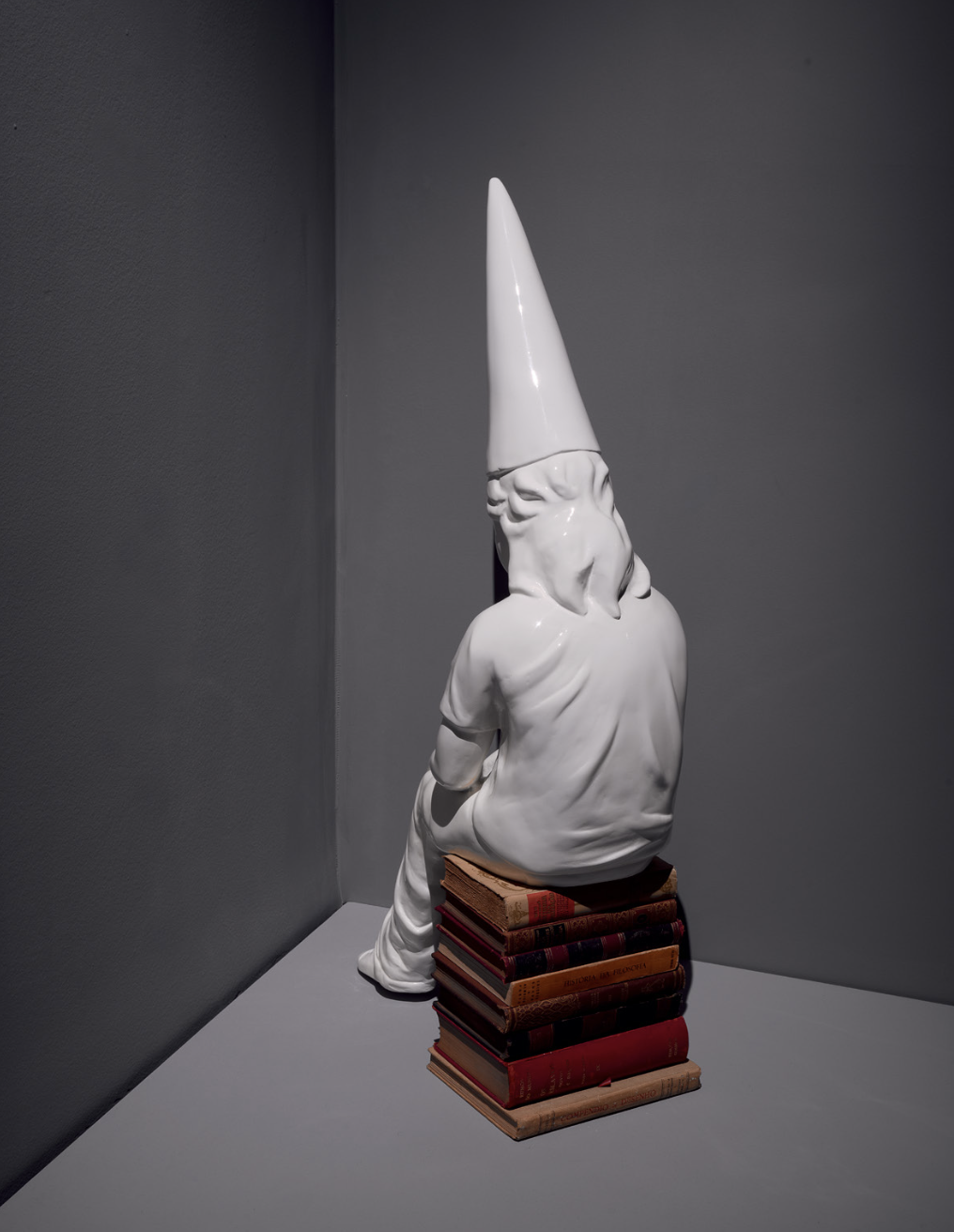 Two other features can be considered points of access in Flávio’s work. One of them, quite literal, is the embedding of real objects in the sculptures. In Cansei de aceitar assim [Tired of Accepting That] (2020), a girl wearing short, tight clothes leans against a real traffic sign with the instruction STOP; in Eu te disse… [I Told You…] (2016), books bury a body lying on the ground of which only the feet are visible; a wooden stool raises the viewpoint in Horizonte infinito [Infinite Horizon] (2013); and a mirror is faced in the work at Pinacoteca, Antes que eu me esqueça [Before I Forget Myself] (2013). Rather than belonging to Flávio’s characters, the objects in these works belong first to the everyday world, to common environments, and are generally familiar items. By bringing this contemporary, everyday universe into the sculpture, an active effort is made to build bridges between reality and fiction, between the work and the viewer. Work’s titles can be perceived in the same way, as many of them have a strong commonplace narrative appeal: No One Can Bring Me Down, Loves Me Not, Infinite Horizon, A Pretext to See You, In Memory of Me, To Be Myself Again, Power. They display a degree of indetermination that is well described by another of his titles: About Everything, But Not About Anything.
